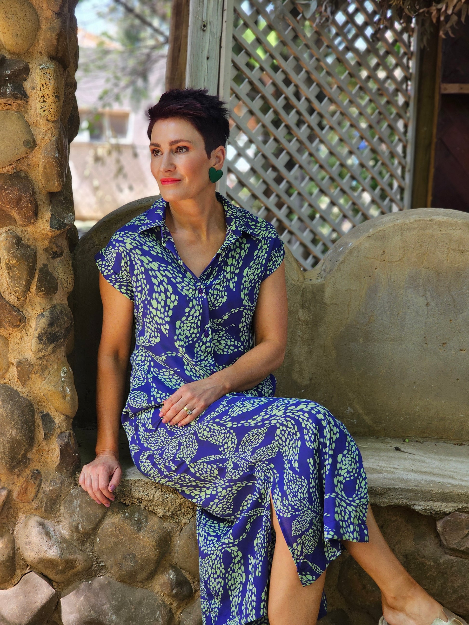 Style: Short sleeve button through shirt dress. Ideal to wear as a "Shacket" over trousers or shorts or as a dress. Long side slits for comfort. Length from underarm= 98cm